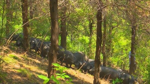在潍坊青州市王坟镇一正有机生态谷,成群的黑山猪散落在森林各处,有的在林间奔跑,有的在树下觅食,有的在溪边喝水,十分惬意。
