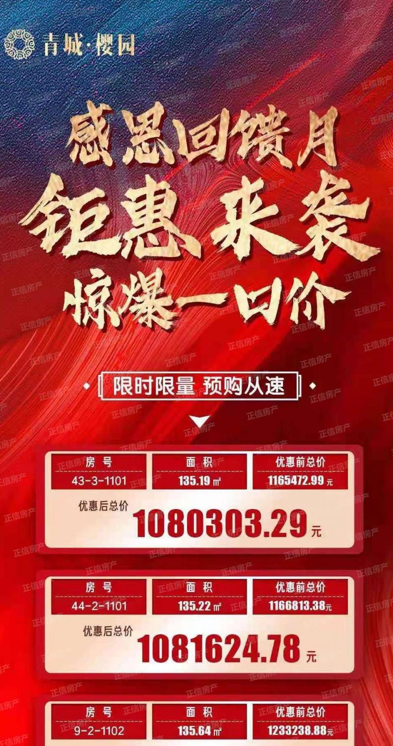 ———⛩青城·樱园⛩ ———? 感恩回馈月 特惠来袭 ??劲爆一口价 6套特价房?钜惠秒杀❗️错过再无?约86~256㎡ 墅质洋房 VIP : 15253618823