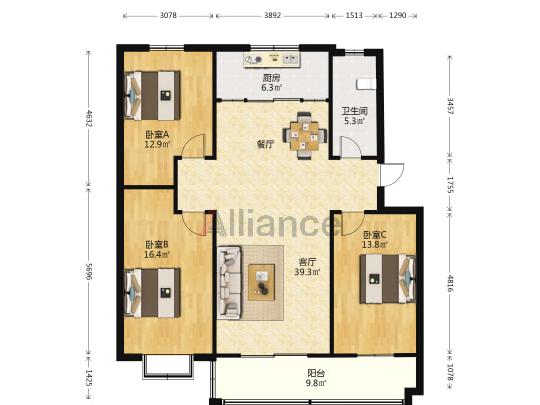 3室2厅1卫 | 117.00㎡ | 2012年建 | 3/5层