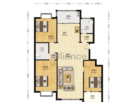 3室2厅1卫 | 90.00㎡ | 5/5层