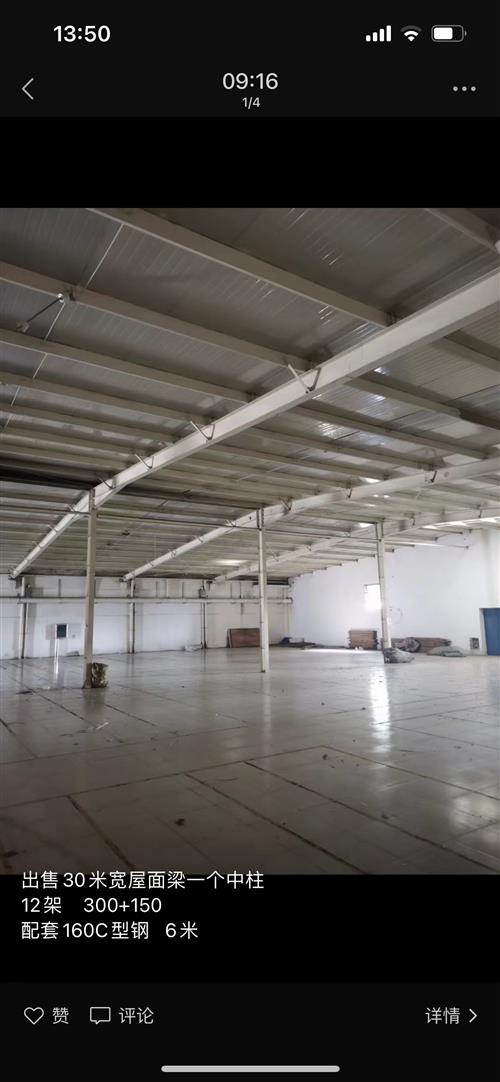 出售钢结构车间 宽30米 型号300?150的H刚 车间顶12架 24米宽的6架 6米160檩条300根。出售84米长25米宽两跨300?150柱子 200?100的梁 檩条型号100的长6米200根 电话15063629777