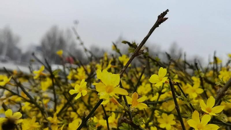 青州市冷空气带来降雨 迎春花开更娇艳