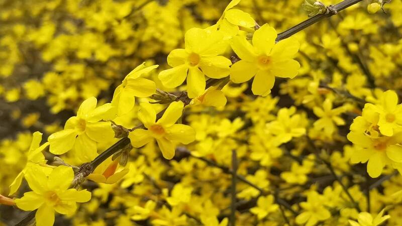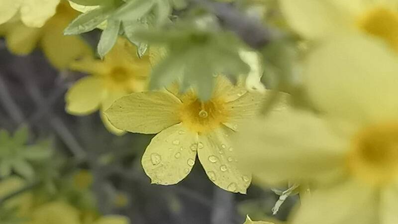 天气乍暖还寒,迎春花在雨中热烈绽放,细密的水珠落在明艳的花瓣上,晶莹剔透、艳丽动人 。