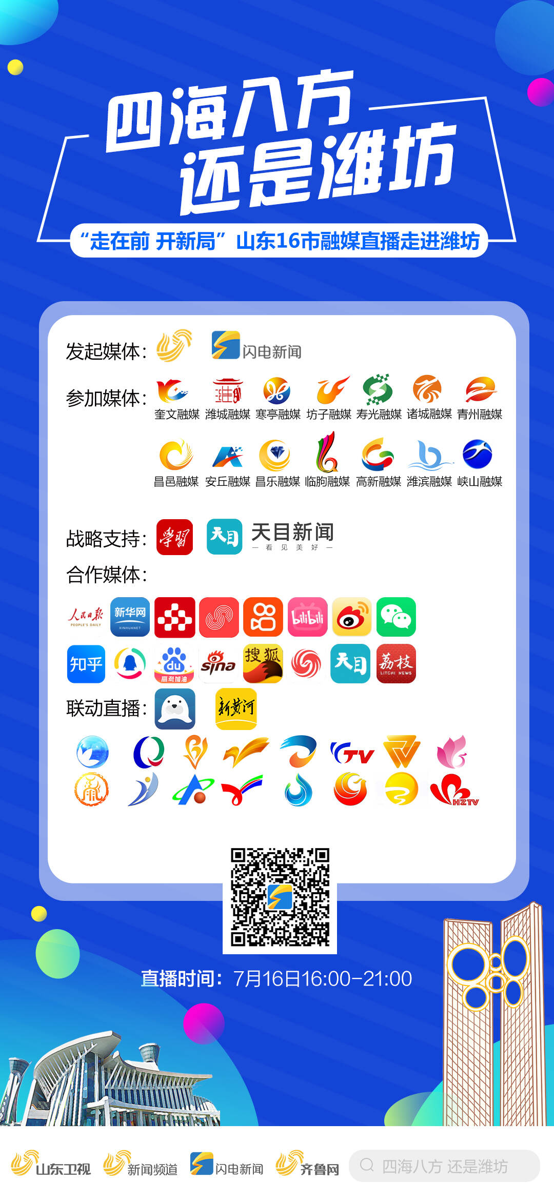 7月-8月,山东广播电视台闪电新闻客户端将推出“走在前 开新局”山东16市大型融媒直播,以全天候、全媒体、全覆盖直播以及新媒体产品的形式,带网友通过沉浸式慢直播、行进式报道形式,聚焦山东各地深入学习贯彻落实省第十二次党代会精神,看“十大创新”新突破、“十强产业”新进展和“十大扩需求”新成效。