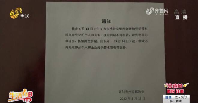 物业经理证实,目前,张先生确实没法充电费,电梯也不能开。当记者接过电话,想要进一步了解的时候,电话那头却没了动静。随后,记者又换号拨打物业经理的电话,仍然无法接通。而楼道里张贴的通知中提到,现大厦的运营权已回归业主方山东高创建设投资集团有限公司,青棹公司有部分租金没有给高创公司。