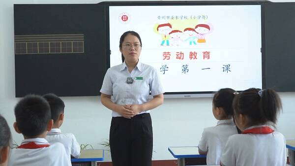 在圣水学校三年级的教室里,以劳动教育为主题的“开学第一课”主题班会正在进行,老师给大家播放爱劳动儿歌,同学们谈假期劳动收获,有的班级还进行劳动大比拼,同学们自己动手整理文具和课桌,在劳动中培养良好习惯。