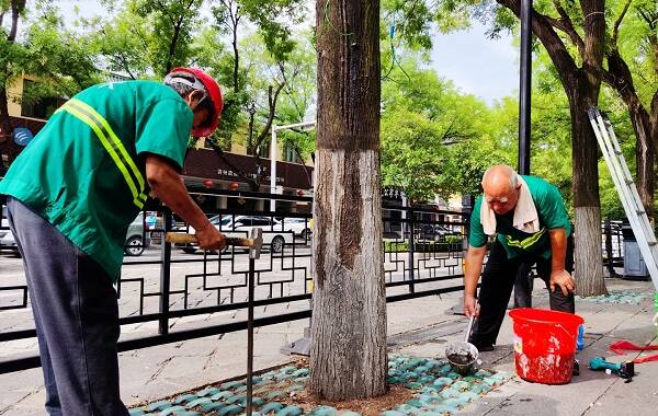 科学复壮,增强行道树“内动力”。根据前期示范路段复壮效果,延续并优化复壮方案,规范落实开土扩穴、回填种植土、施加叶面肥、挂施营养液等整治举措,并采取钻孔浇灌生根剂和营养剂、根灌杀菌剂和内吸剂等方式,用以专项防治根腐病、蛀干害虫、蚜虫等病虫害,保证绿化树木健康生长。