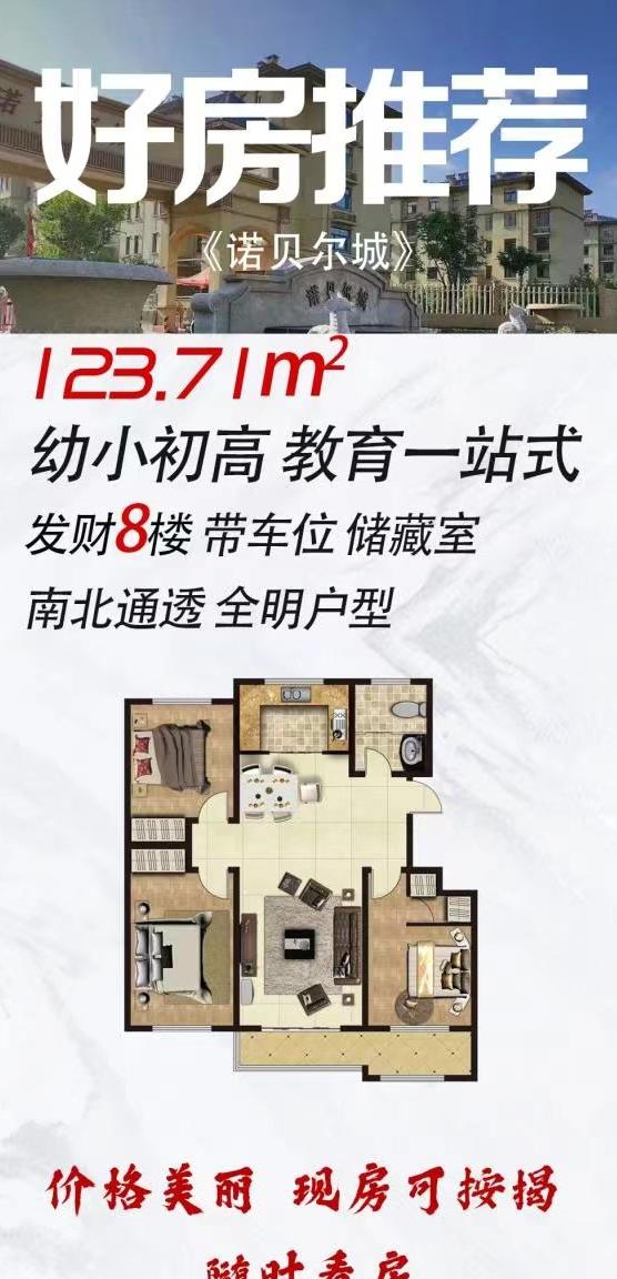 诺贝尔城电梯8楼124平,南北通透户型,毛坯现房带车位储藏室,不冲路不冲角94.8万可按揭