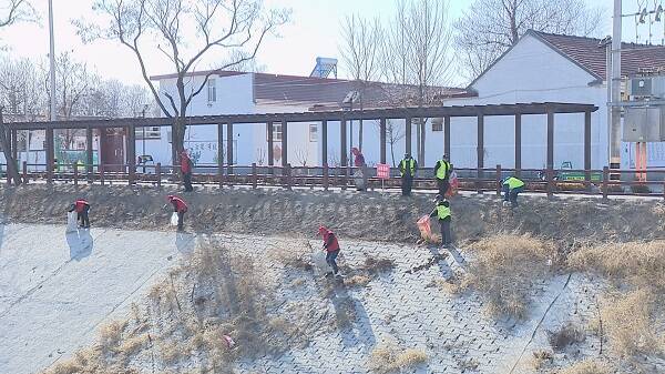 2月27日,在青州市高柳镇南马兰村,刚刚清理完村庄卫生的志愿服务队员来不及休息,就带上工具到北阳河畔,捡拾河道杂物,清理两岸卫生。