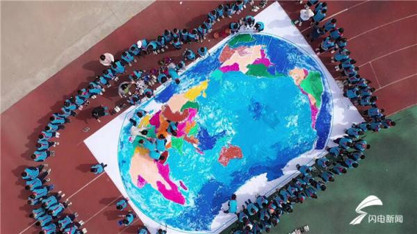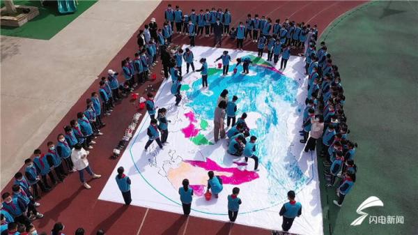 用画笔勾勒地球,用想象点亮未来。在青州市王府街道团结小学的操场上,200余名小学生用手中五彩的画笔为地球母亲披上鲜艳的外衣,他们用稚嫩的小手,画出了色彩斑斓的七大洲四大洋,并以这种方式向人们宣告:地球是我们美丽的家园,保护地球,从我做起,从爱护身边的一花一木;节约每一滴水、每一度电、每一张纸;拒绝污染;珍爱与我们朝夕相处的地球妈妈!