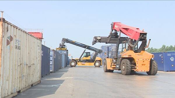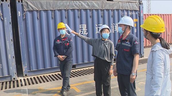 5月24日,在山东港天物流有限公司,大型机械正一刻不停地将东北发来的3万吨集装箱粮食进行返空。服务企业专员、东夏镇经贸办副主任王丽像往常一样与企业负责人走进基地,了解生产运营状况。