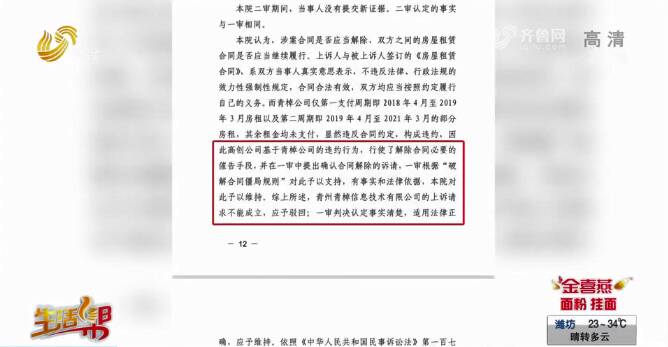 为了弄清楚竣邦大厦的运营权到底归谁,记者第二次找到高创青州竣邦物业,工作人员表示运营权归高创公司,并且还给了记者一份潍坊市中级人民法院的民事判决书。其中提到:高创公司基于青棹公司的违约行为,行使了解除合同必要的催告手段,并在一审中提出确认合同解除的诉请,一审根据“破解合同僵局规则”对此予以支持,有事实和法律依据,本院对此予以维持。