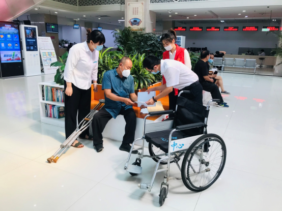 8月11日,手拄双拐的李华生独自一人到政务服务中心办理病退业务。发现这一情况后,工作人员王英杰立即推出便民轮椅并与公共就业和人才服务中心窗口“陪办服务”人员李继祥进行了交接。