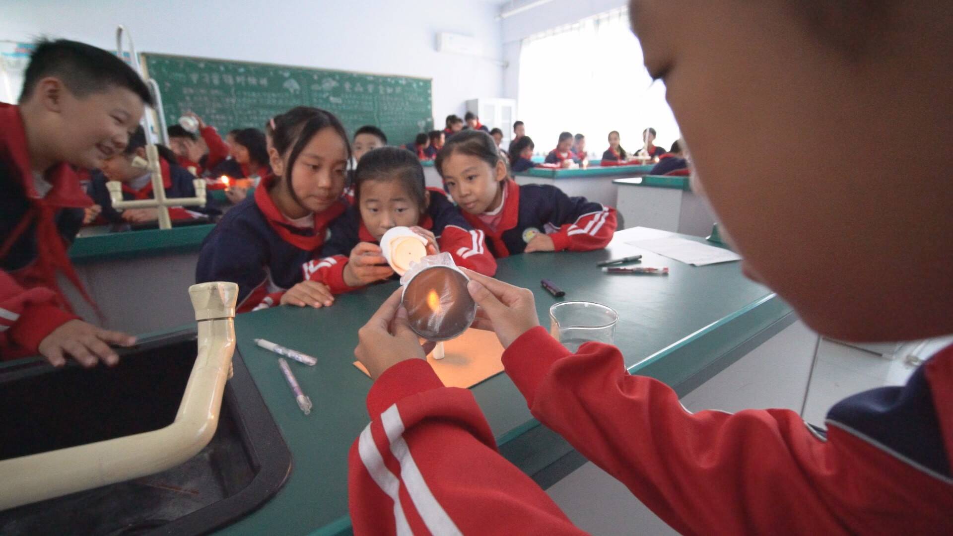 王府街道刘井小学教室里,老师利用一次性纸杯,塑料纸,蜡烛等材料带领同学们探究小孔成像的原理,同学们亲自动手操作,在纸杯开口的一端蒙上塑料纸,在纸杯底部戳一个小孔,将杯子有孔的一端靠近燃烧的蜡烛,通过改变杯子与蜡烛的距离,观察蜡烛成像的变化,在实验过程中,同学们也将科学知识牢记于心。