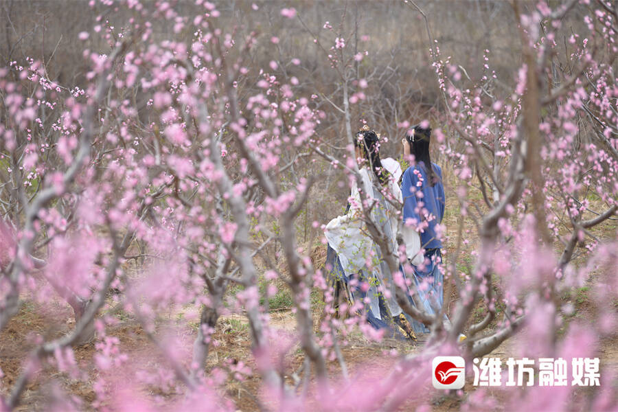 两名古装爱好者在青州王府街道郑家村桃林赏花。